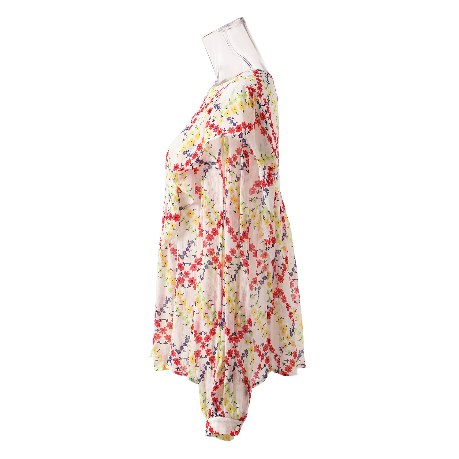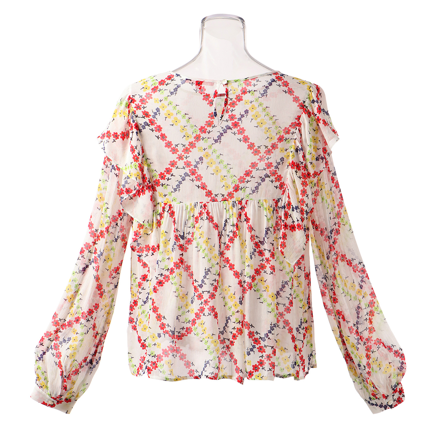 格子状に配置したカラフルなフラワープリントがかわいらしいブラウス。身頃の切り替え部分にはギャザーをたっぷり取り入れてふんわりとしたシルエットに仕上げています。レイヤードした袖のデザインもポイント。シーズンムードを盛り上げる軽やかなアイテムです。
