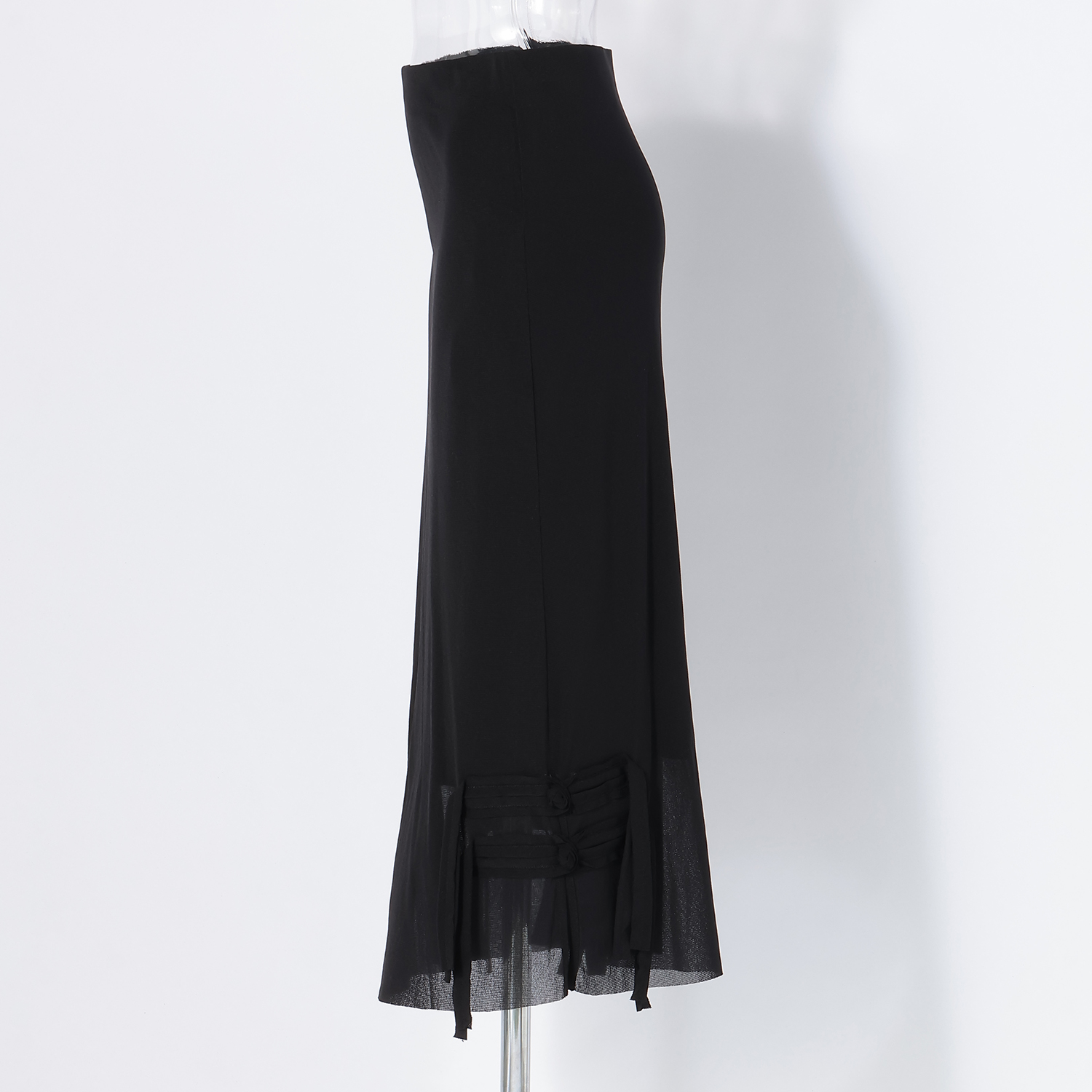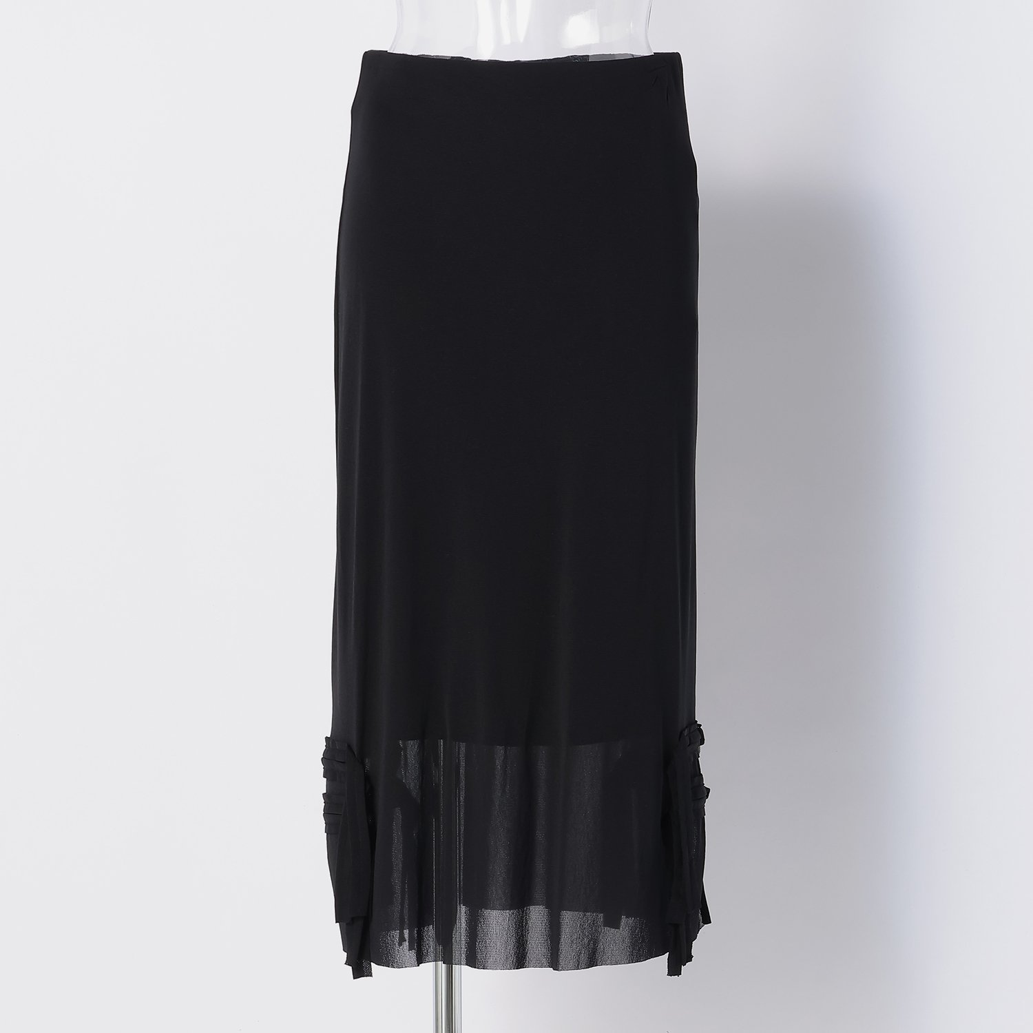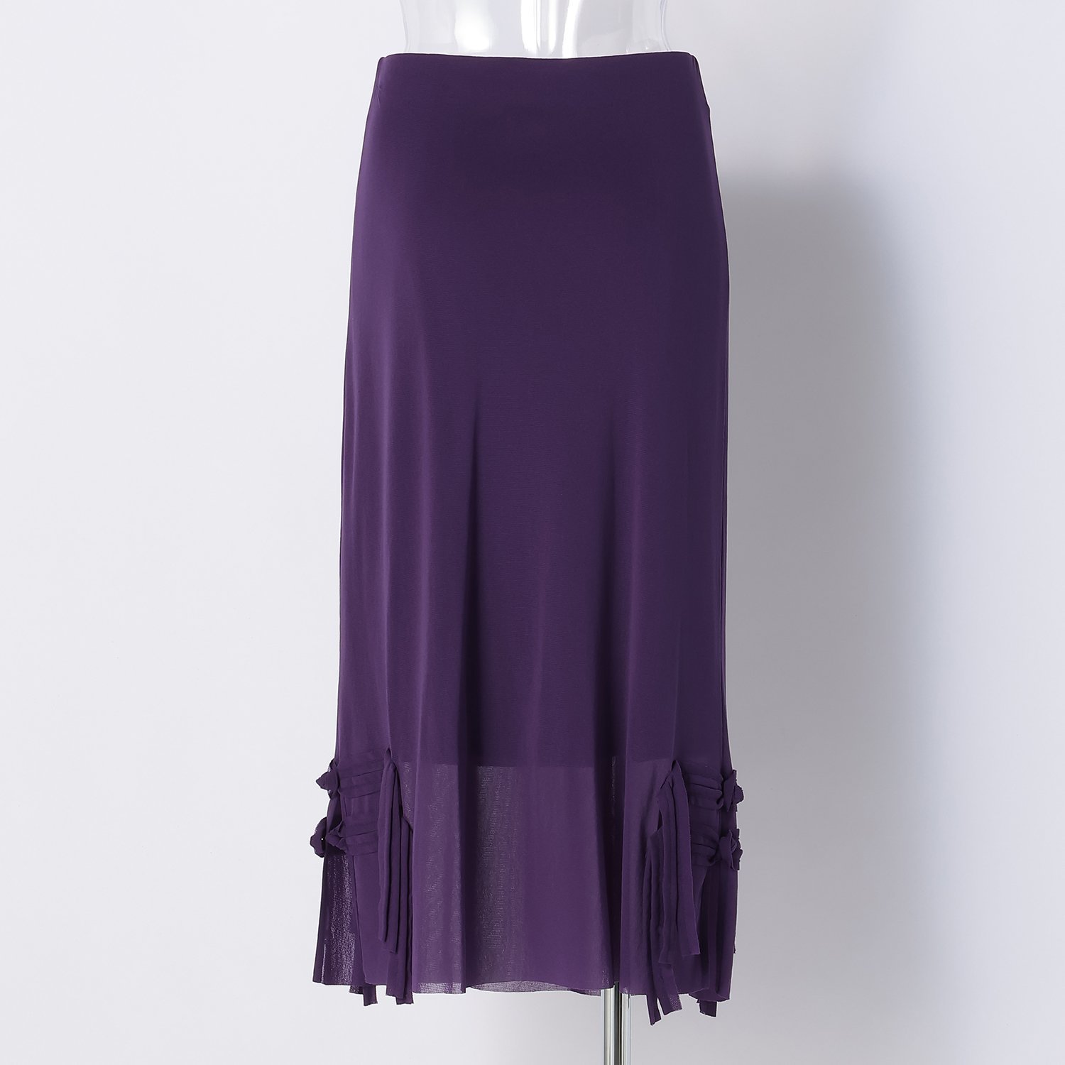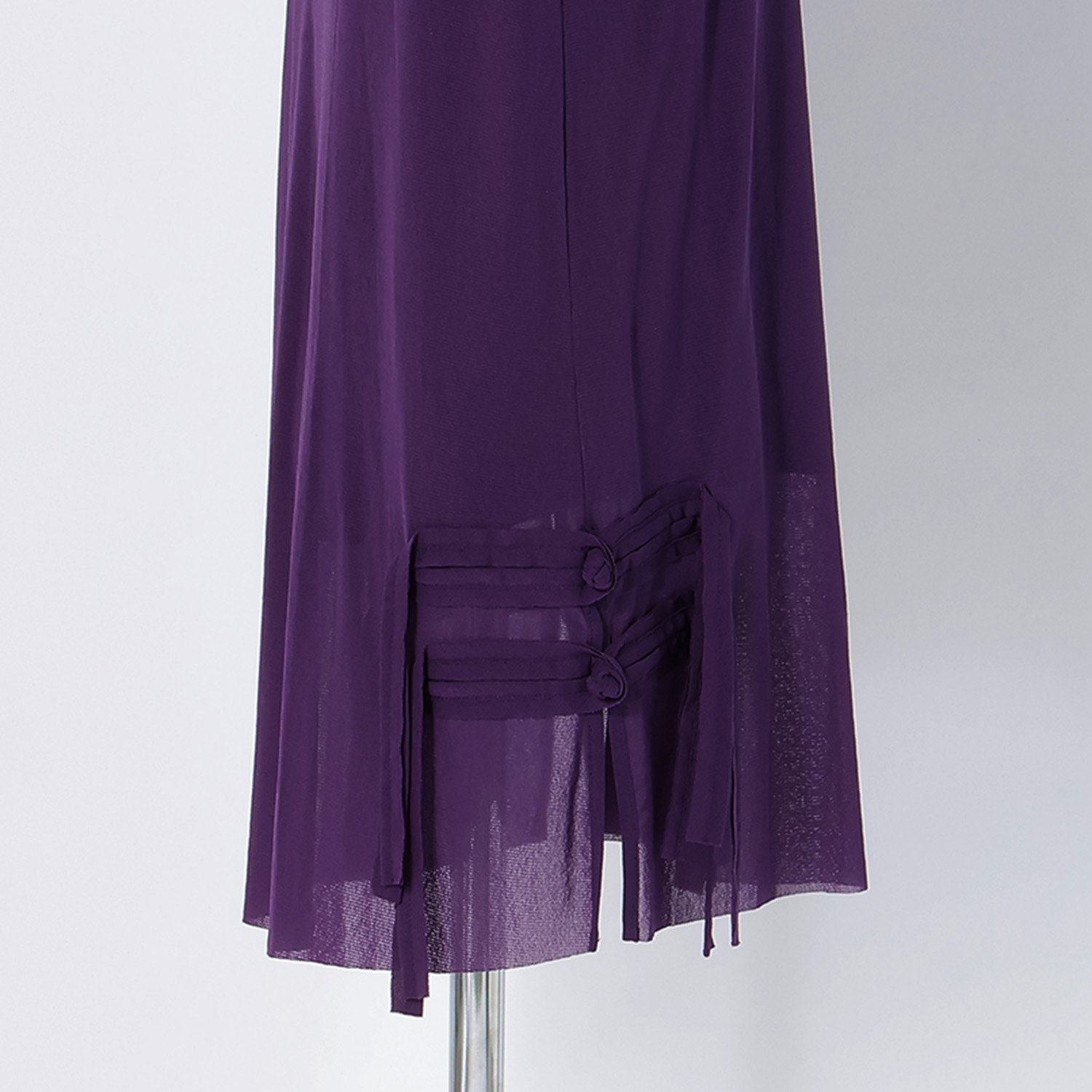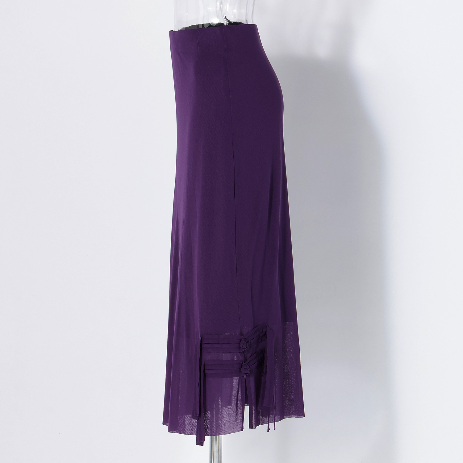 裾のサイドにチャイナボタンのフリンジをあしらったスカート。VIVIENNE TAMらしさ溢れるデザインで、動きに合わせて揺れる裾のラインがエレガントな印象を与えます。裏地は表地よりも短く、足元の程よい透け感が洗練された雰囲気を演出。単品ではもちろんのこと、同素材のトップスと合わせたセットアップスタイルもおすすめです。