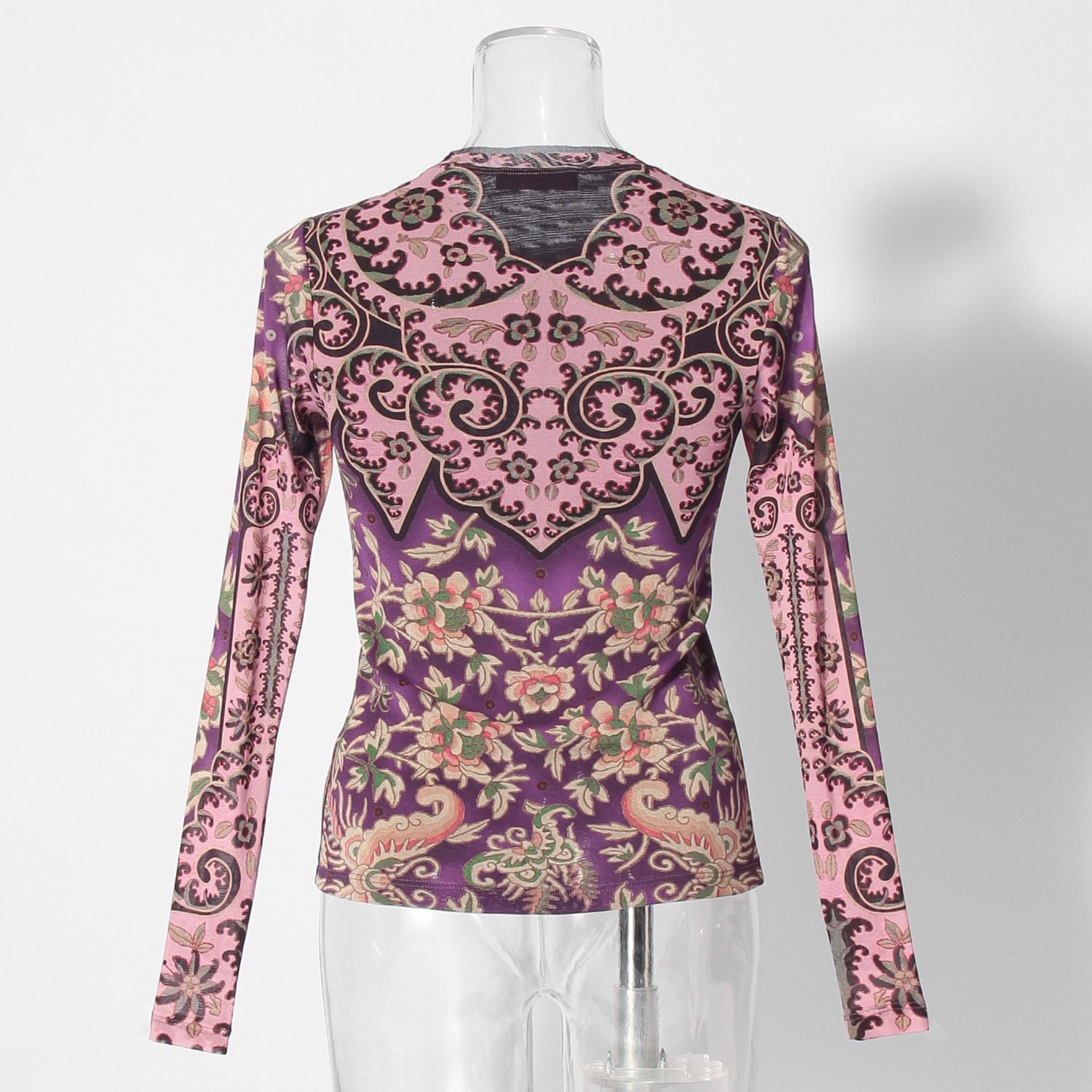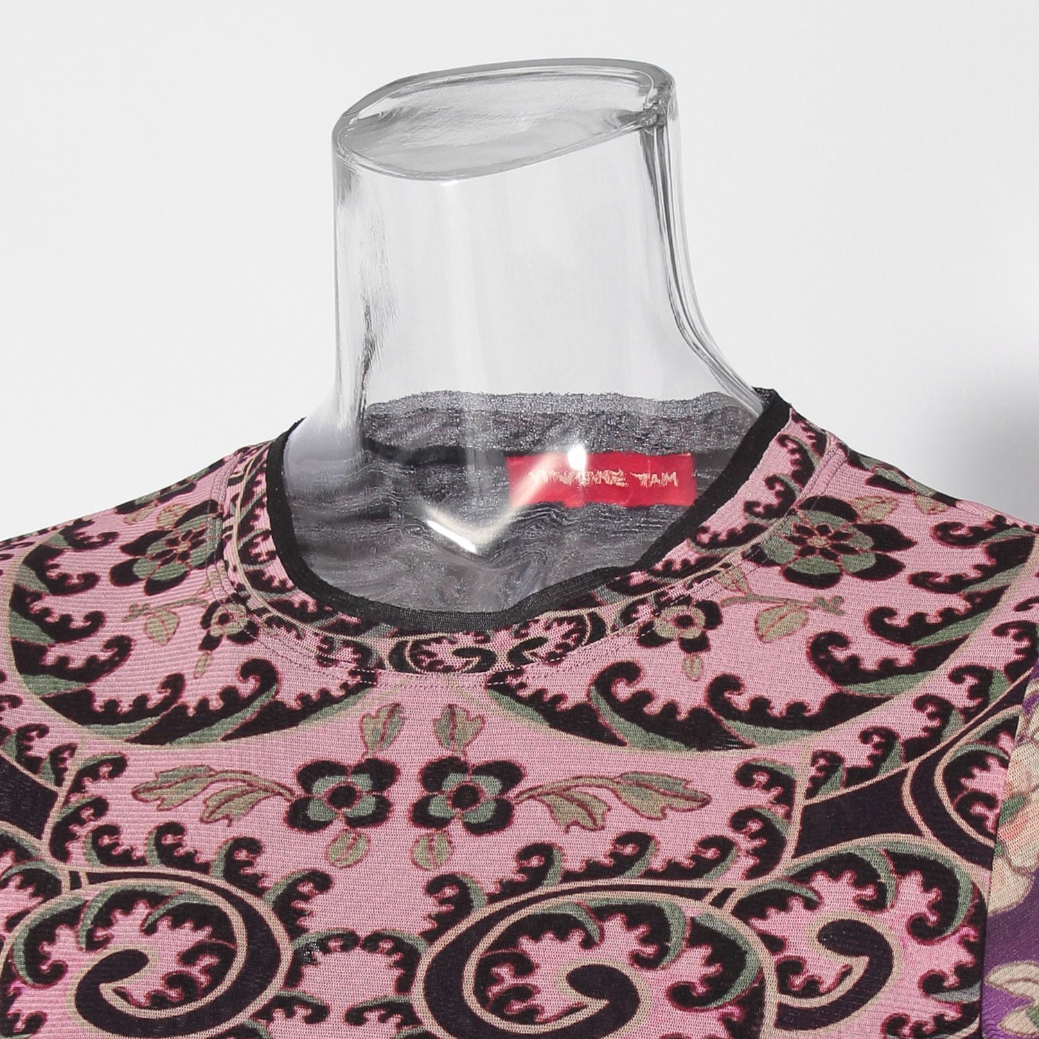 ゴージャスなムードを盛り上げるピオニーとバタフライの模様を組み合わせたブラウス。細身のクルーネック型で身体のラインをすっきりと美しく見せ、女性らしいシルエットを演出します。身頃は透け感が気にならない2枚仕立てで、袖は1枚仕立てのため軽やかにご着用いただけます。