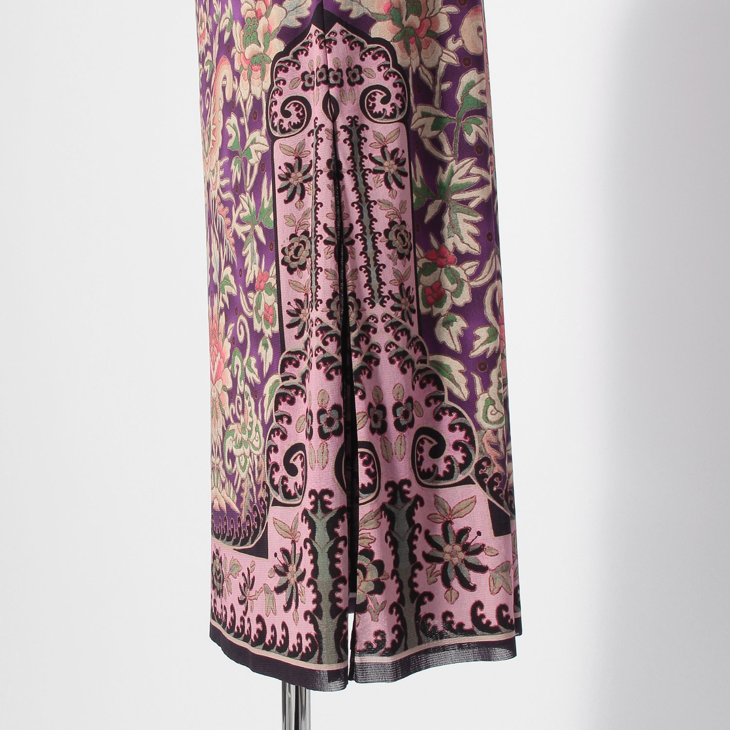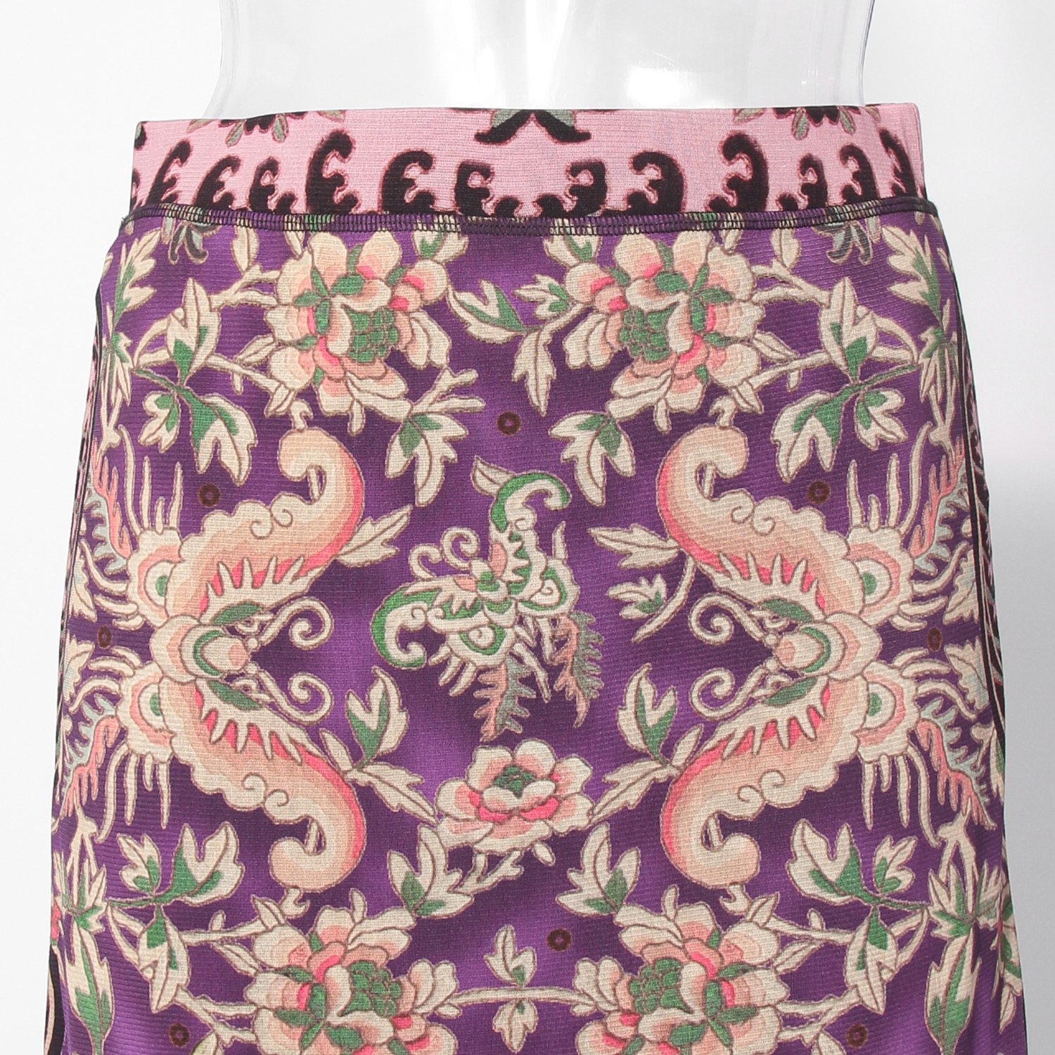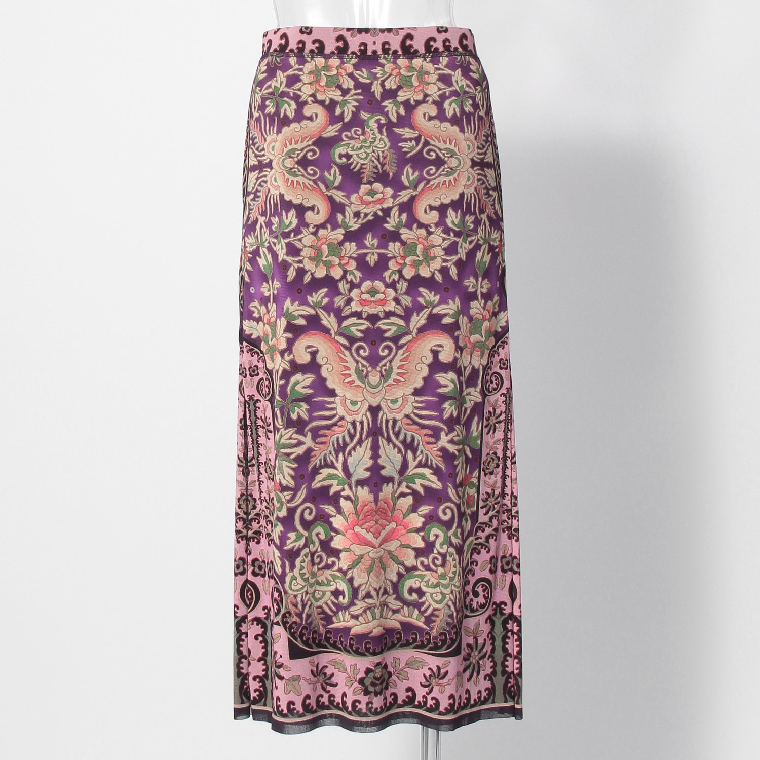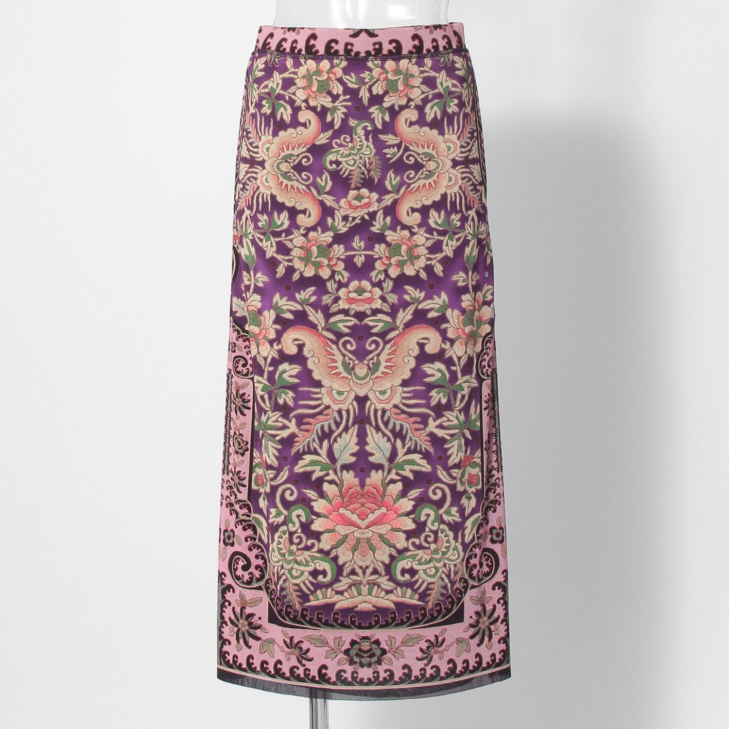華やかなピオニーバタフライのプリントが目を引くスカート。ややタイトな仕立てでレッグラインをすっきり見せてくれるのが魅力です。ロング丈でしっかりとした存在感があり、さまざまなスタイルに合わせやすい一着です。