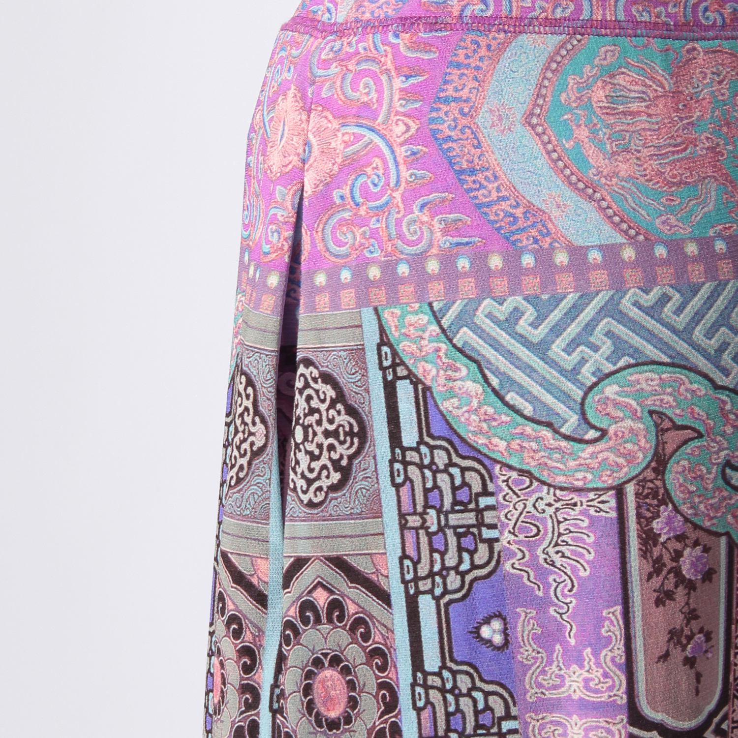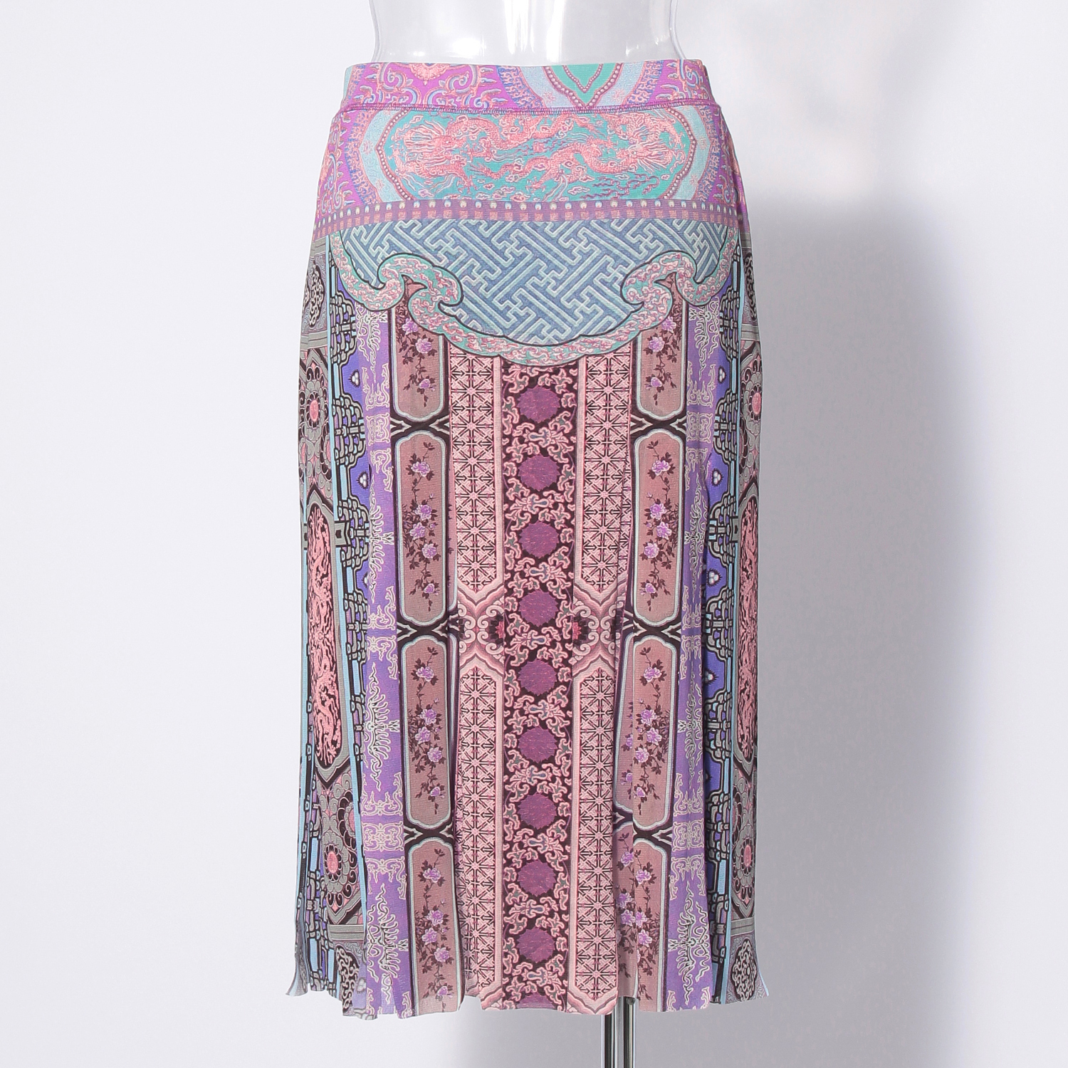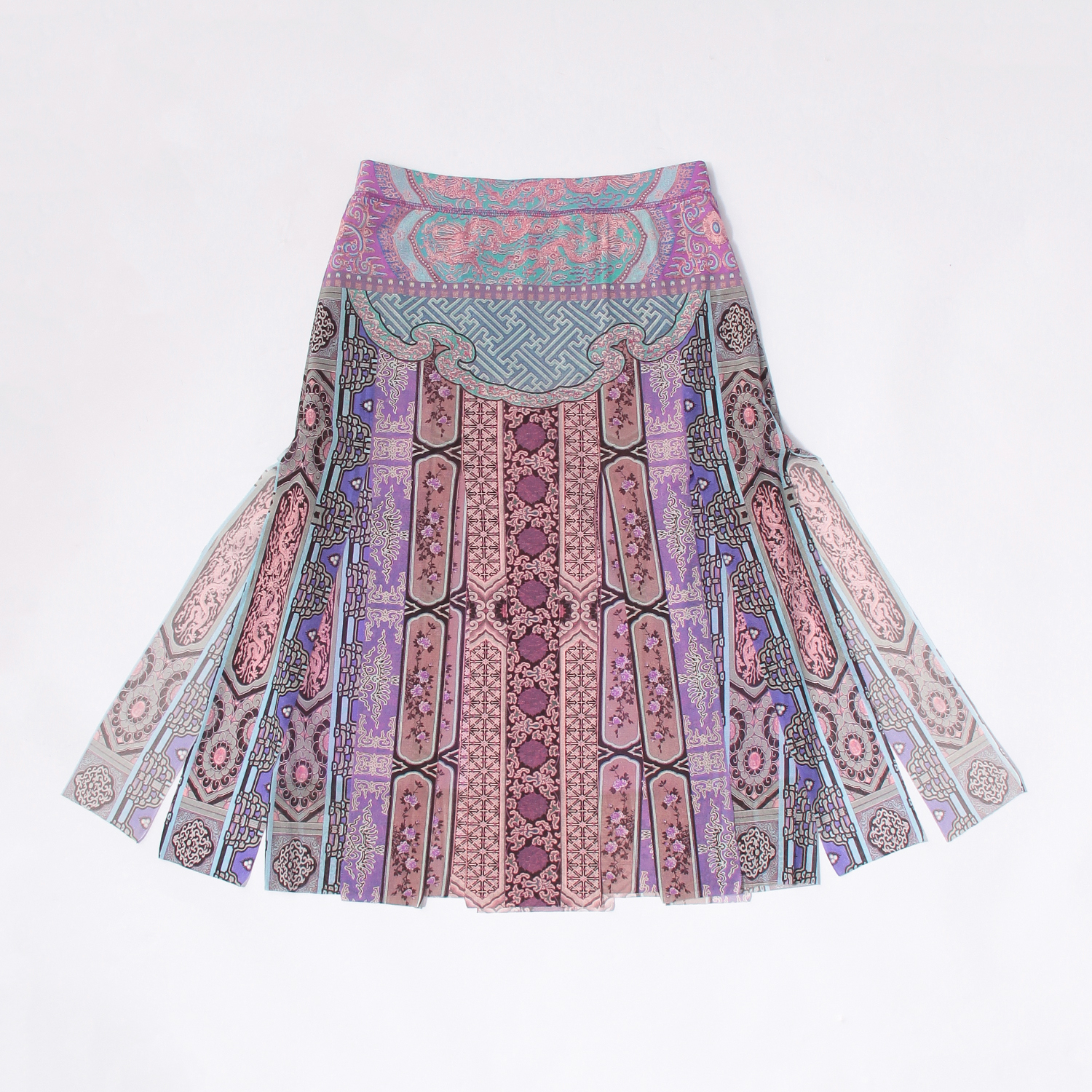 2000年代当時も人気を誇った「パレスプリントシリーズ」をリバイバルしたスカート。やや長めに設定された着丈が上品な印象を与え、歩くたびに揺れる短冊状の裾とフリンジのようなプリントが軽やかな動きを生み出します。VIVIENNE TAMらしい個性と細部へのこだわりが詰まった一着です。