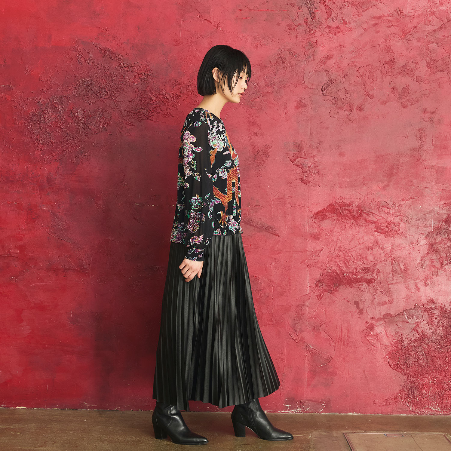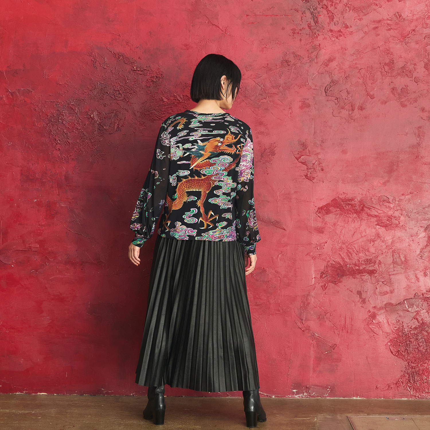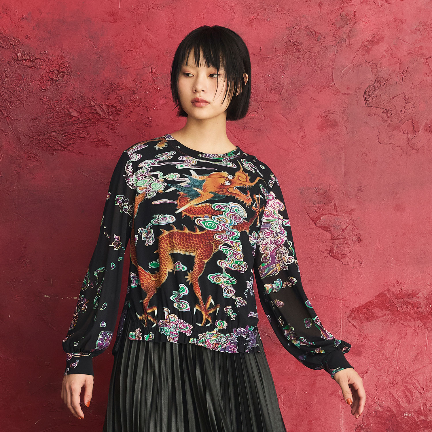 迫力のあるプリントで気分も盛り上げてくれそうなブラウス。螺鈿細工の雲の中を泳ぐドラゴンを描いた、アイコニックなルックスが特徴です。フロントにシャーリングを寄せる、新型デザインにもご注目。締め付けを感じにくいゆったりとしたクルーネックで、着心地にもこだわりが覗きます。