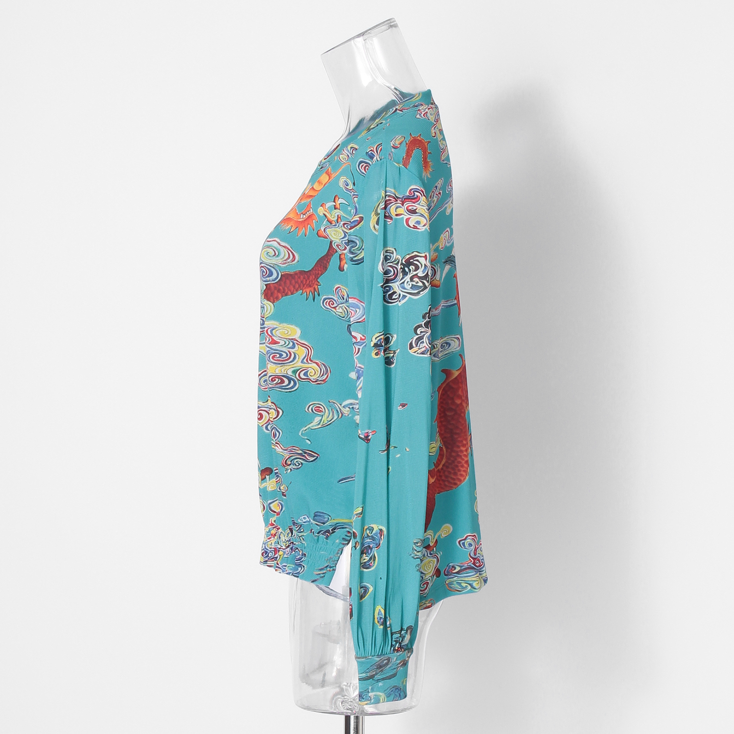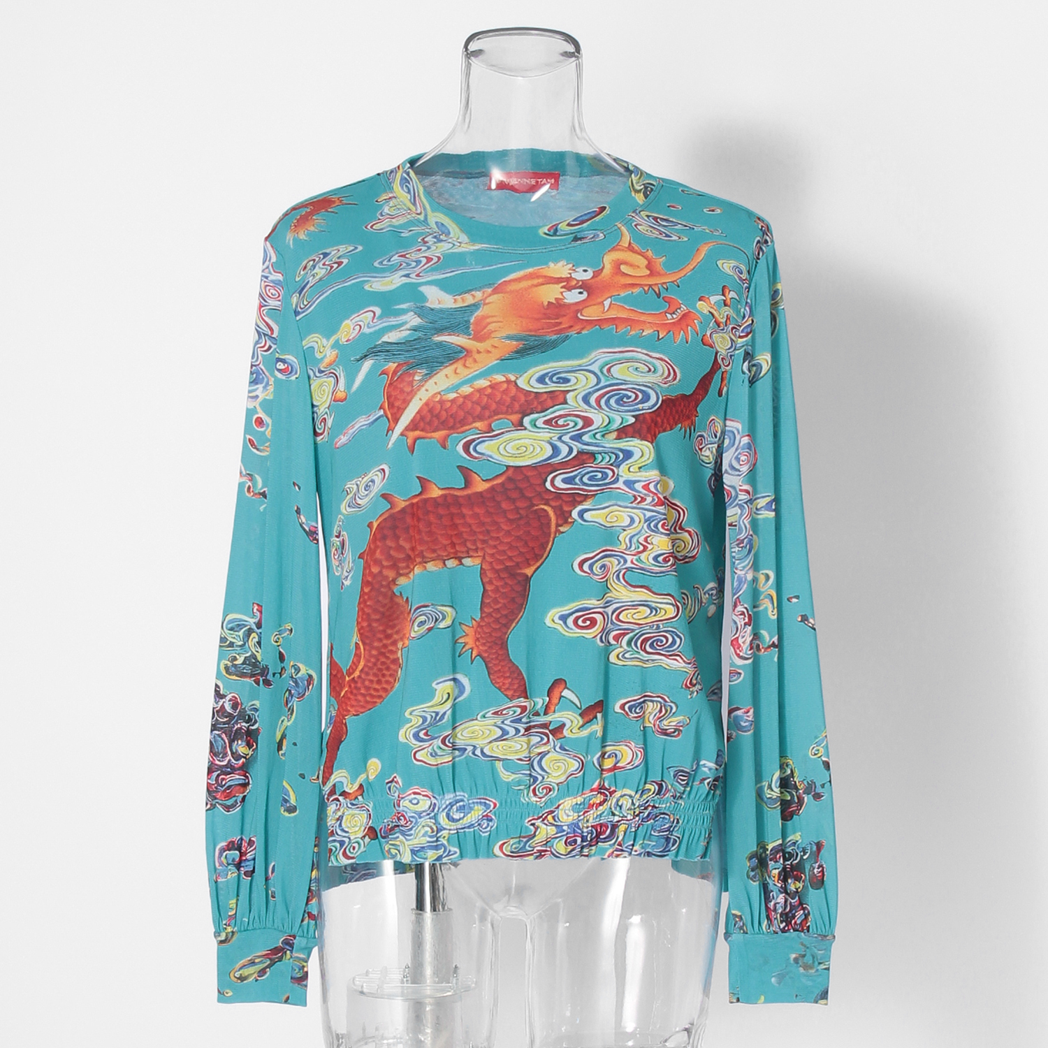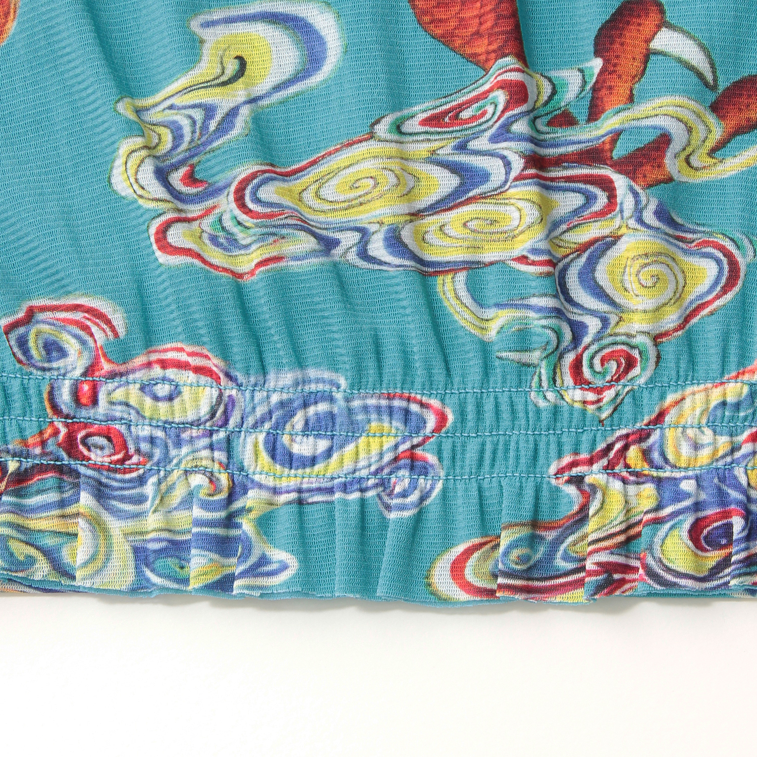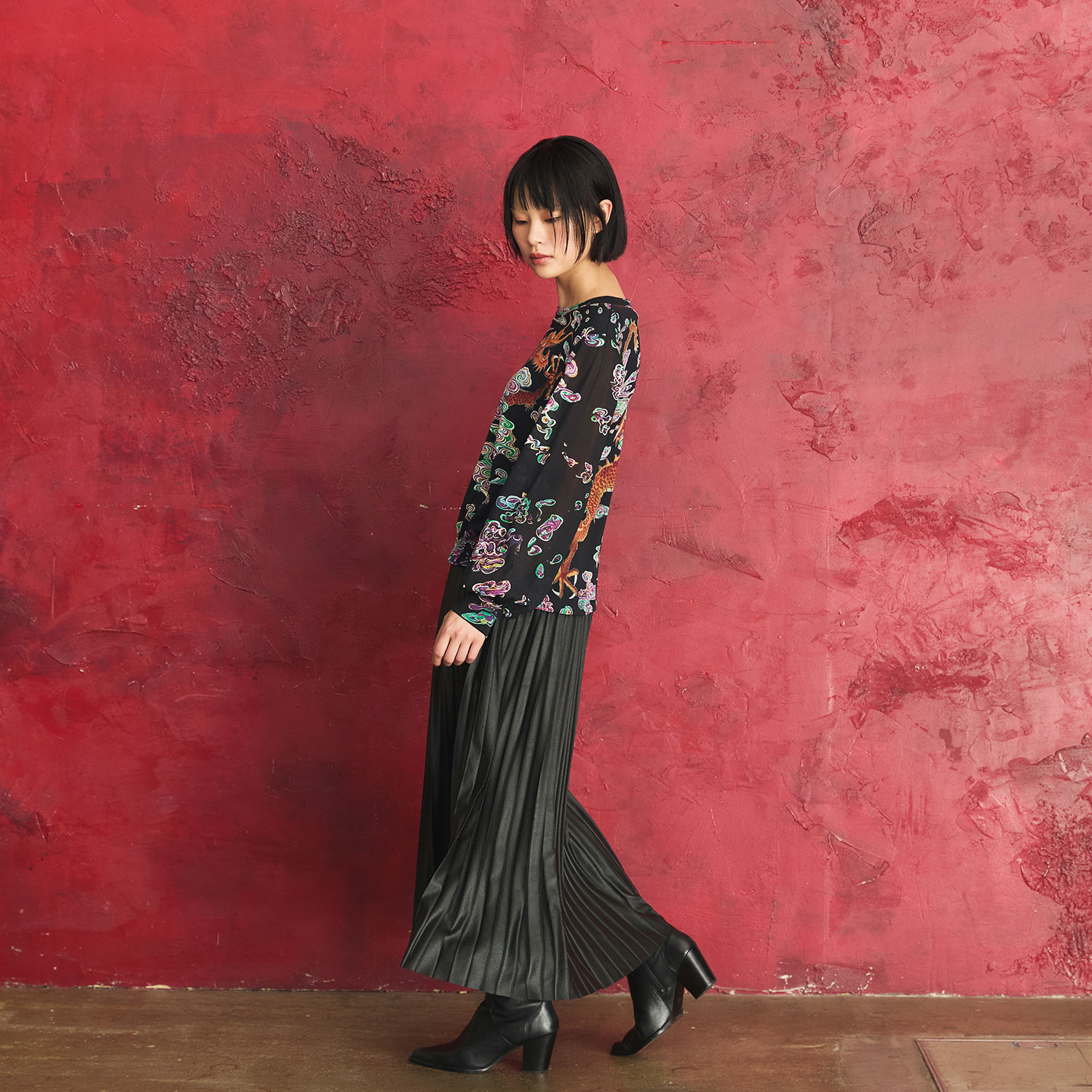 迫力のあるプリントで気分も盛り上げてくれそうなブラウス。螺鈿細工の雲の中を泳ぐドラゴンを描いた、アイコニックなルックスが特徴です。フロントにシャーリングを寄せる、新型デザインにもご注目。締め付けを感じにくいゆったりとしたクルーネックで、着心地にもこだわりが覗きます。