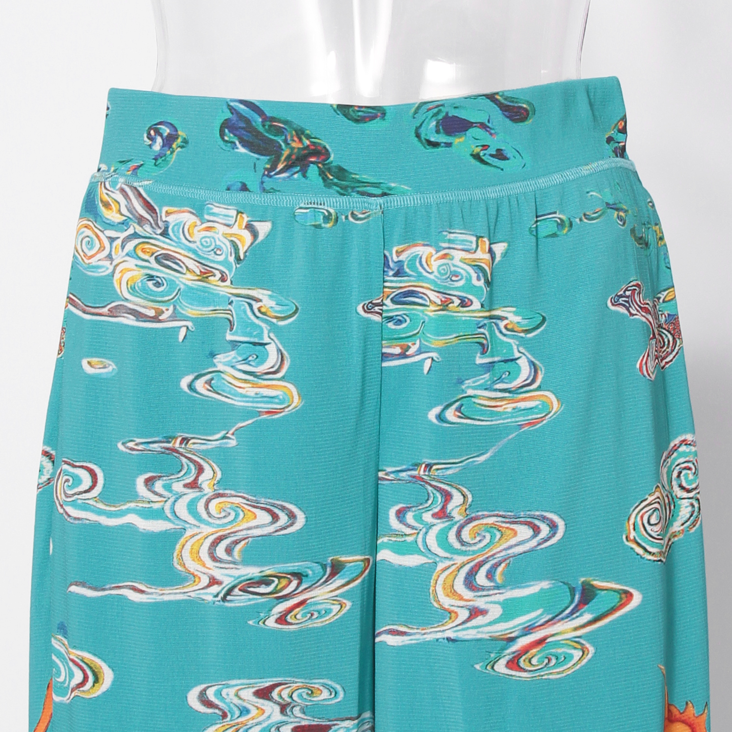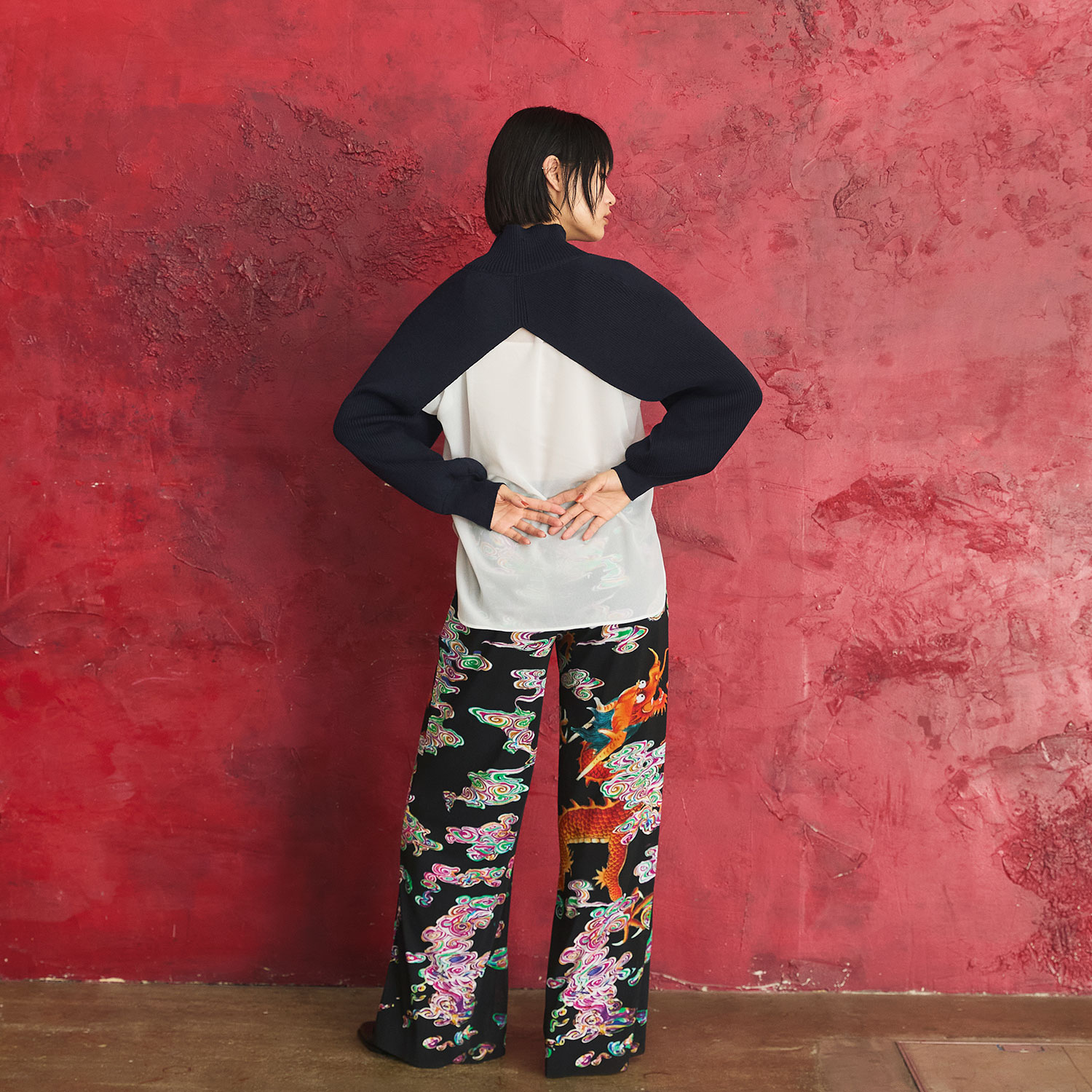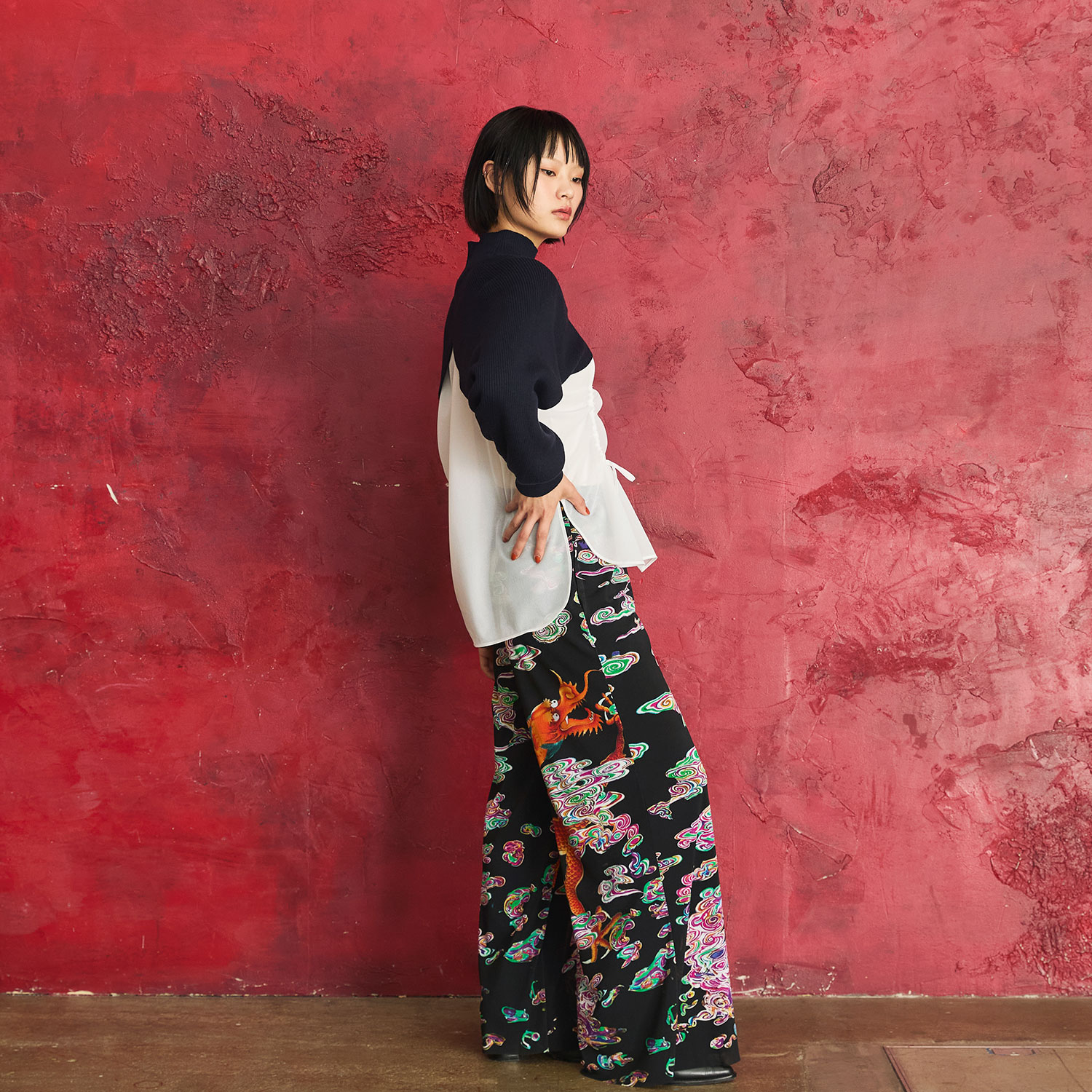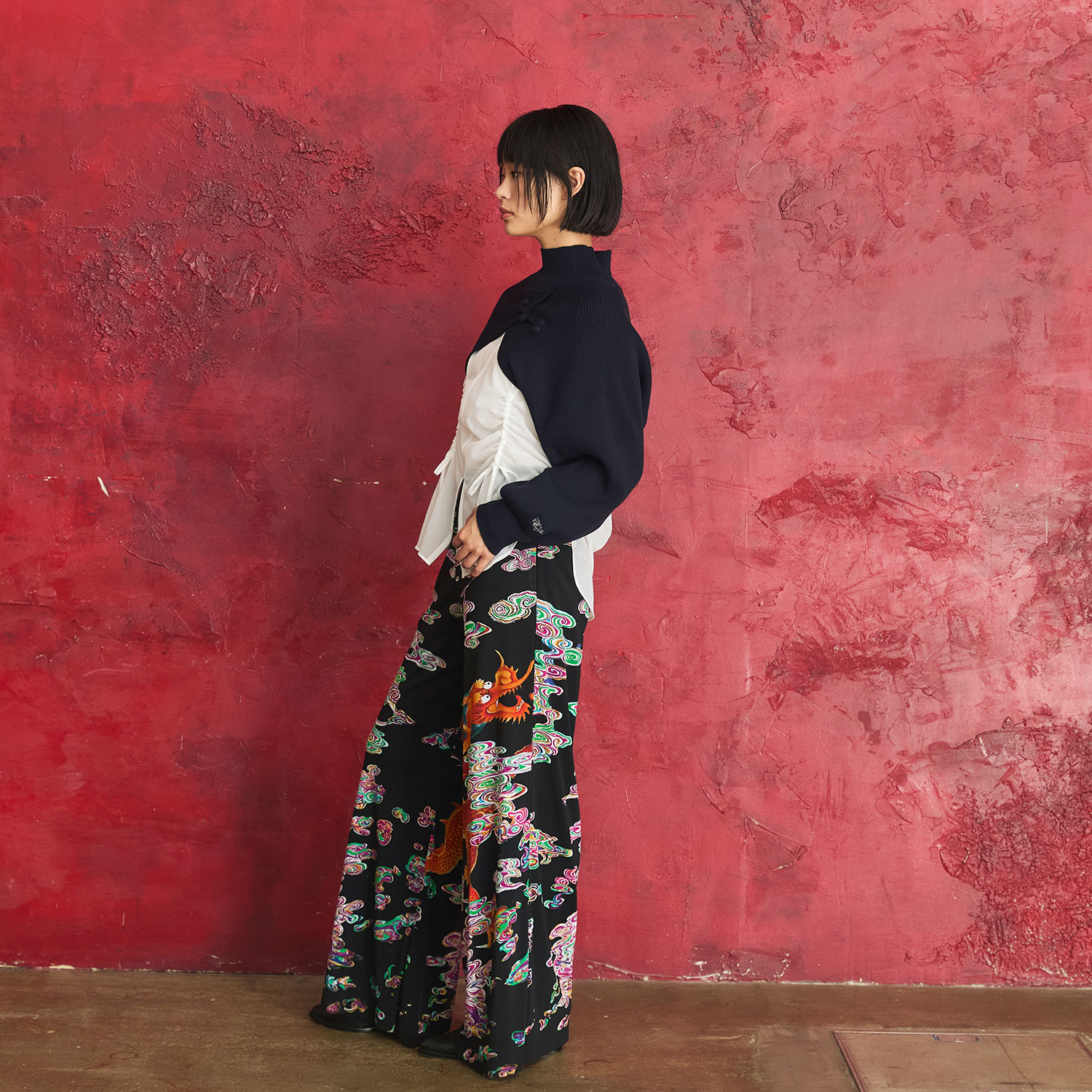 螺鈿細工の雲の中を泳ぐドラゴンを描いたプリントが迫力を放つパンツ。シルエットは合わせやすい定番タイプで、存在感のある柄でもコーディネートに取り入れやすいのが魅力的なポイントです。美しいドレープを感じる生地の表情にもご注目ください。