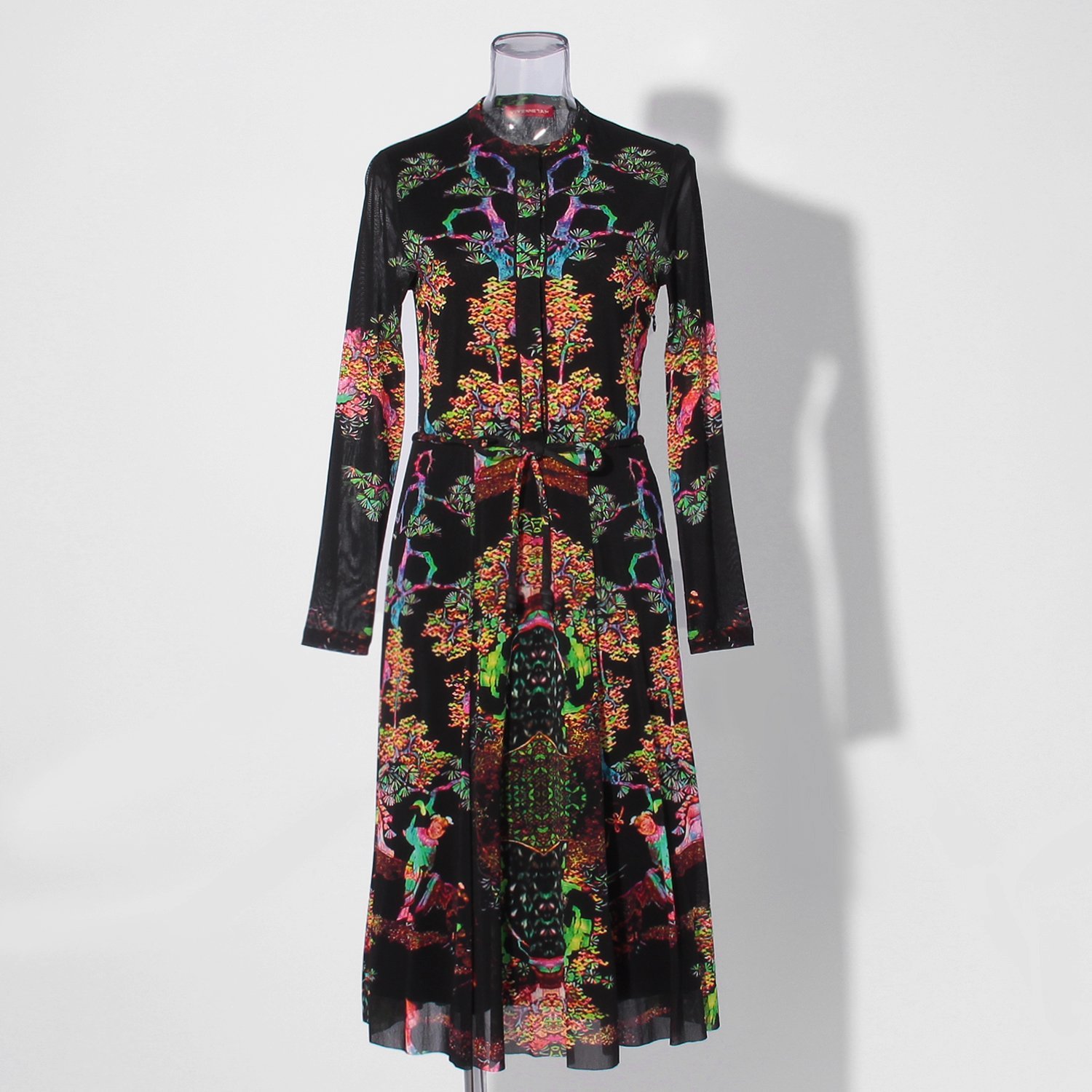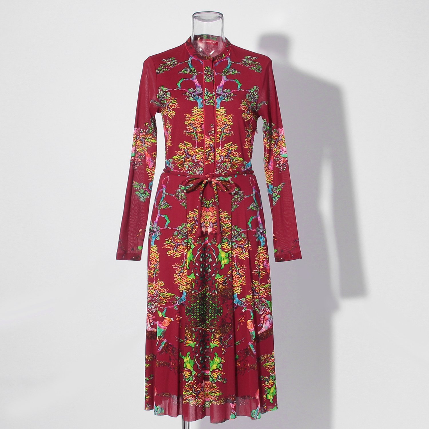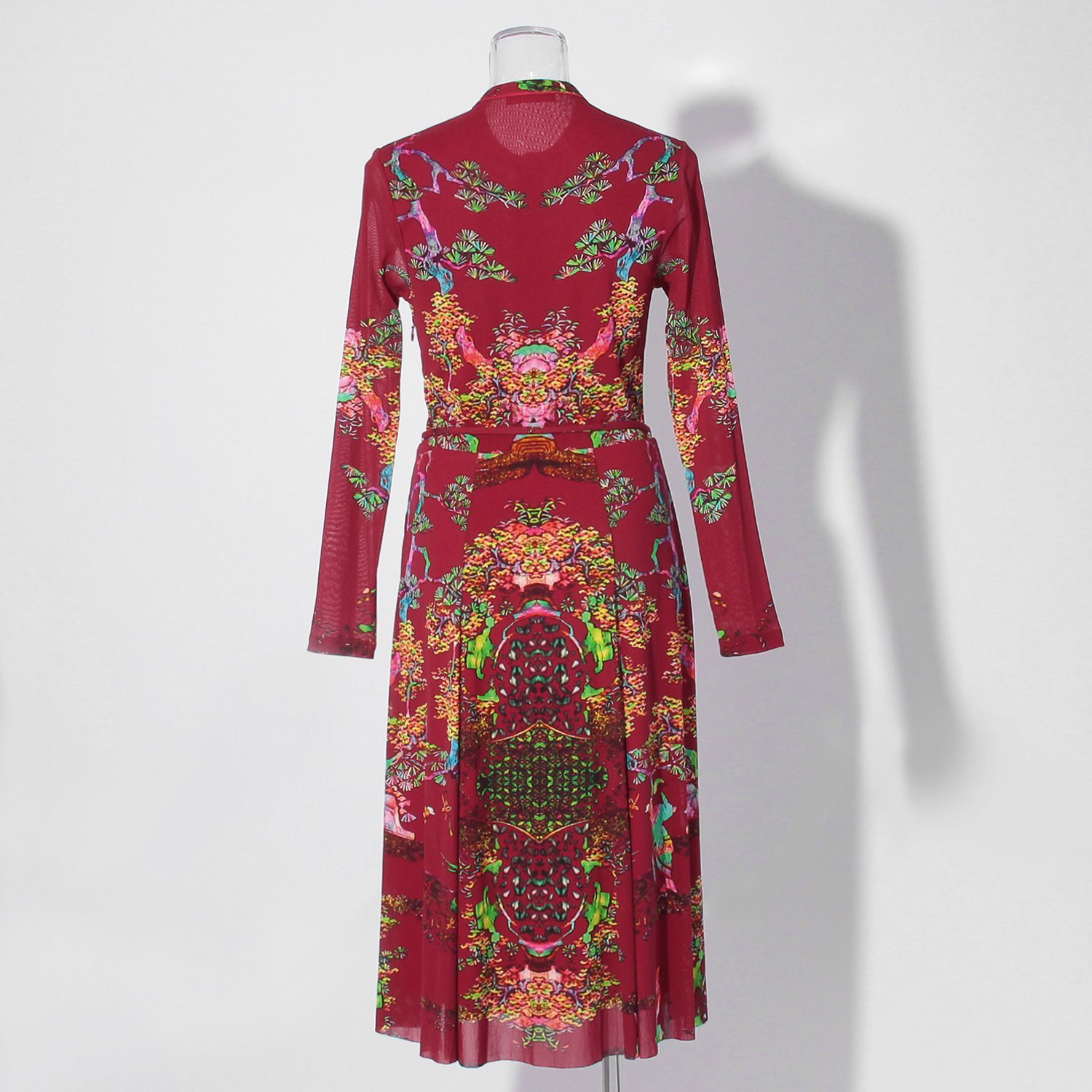 中国の伝統的な風景模様をモチーフにしたワンピース。白蝶貝を彷彿とさせる螺鈿細工風のオーロラのきらめきを、プリントで表現しました。柄が活きるフィット&フレアのシルエットで、スタイリングを上品に演出。比翼仕立てのハイネックデザインにより、きちんと感も兼ね備えています。