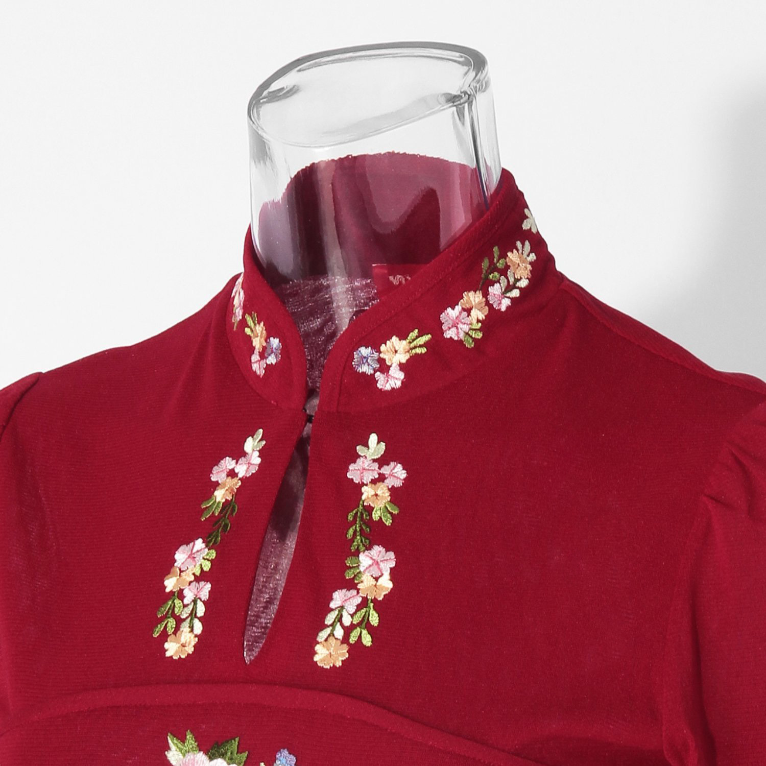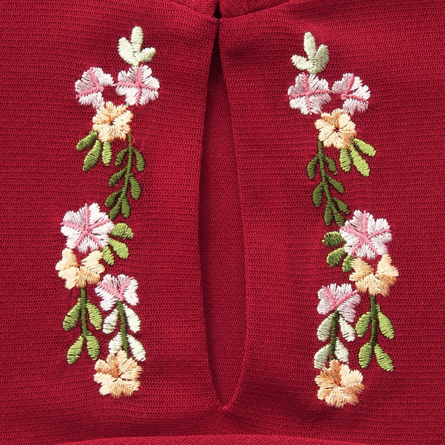 アイコニックなコレクション「フラワーエンブロイダリーシリーズ」を復刻したブラウス。全体に施された繊細なフラワー刺繍が、ブラックやレッドのボディに映え、スタイリングを華やかに演出します。やや長めのパフスリーブが女性らしい雰囲気をプラス。シンプルな半袖のチャイナカラーを採用し、きちんと感がありながらもデイリーからお出かけまで幅広く活躍する一着です。
