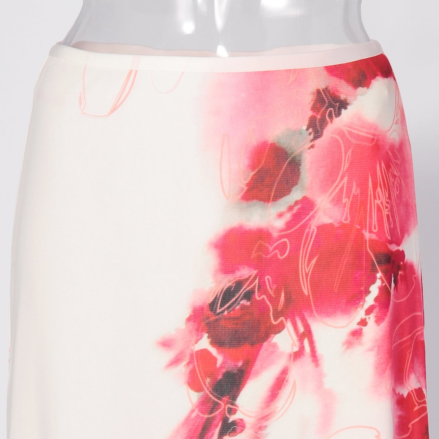 全体に描かれた大胆な桜の花が彩るスカート。シャープな輪郭線と滲む色彩を組み合わせた華やかなモチーフが、存在感を放つ1枚です。シンプルな台形シルエットなので、同シリーズのトップスと合わせてセットアップ風に着こなすのもおすすめです。