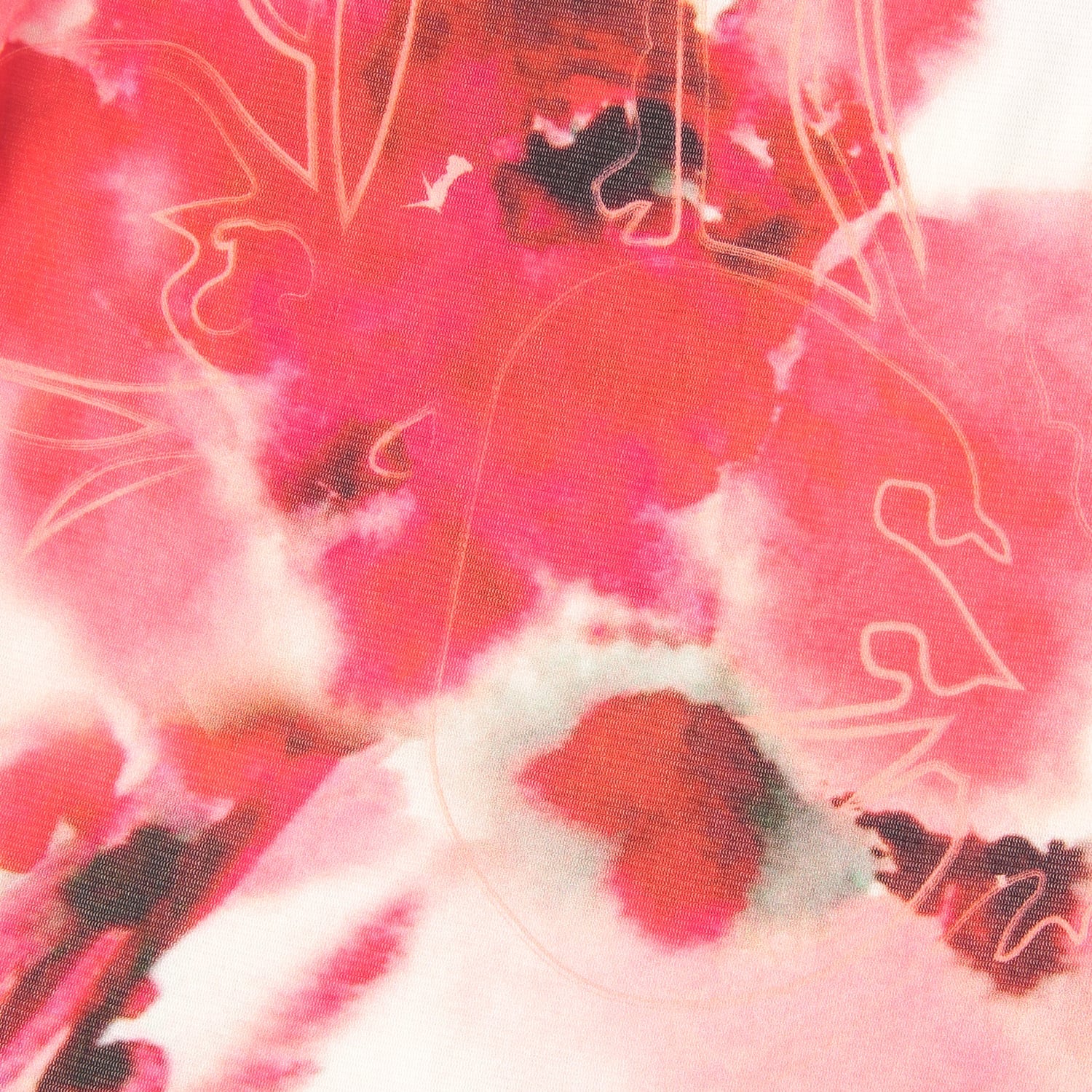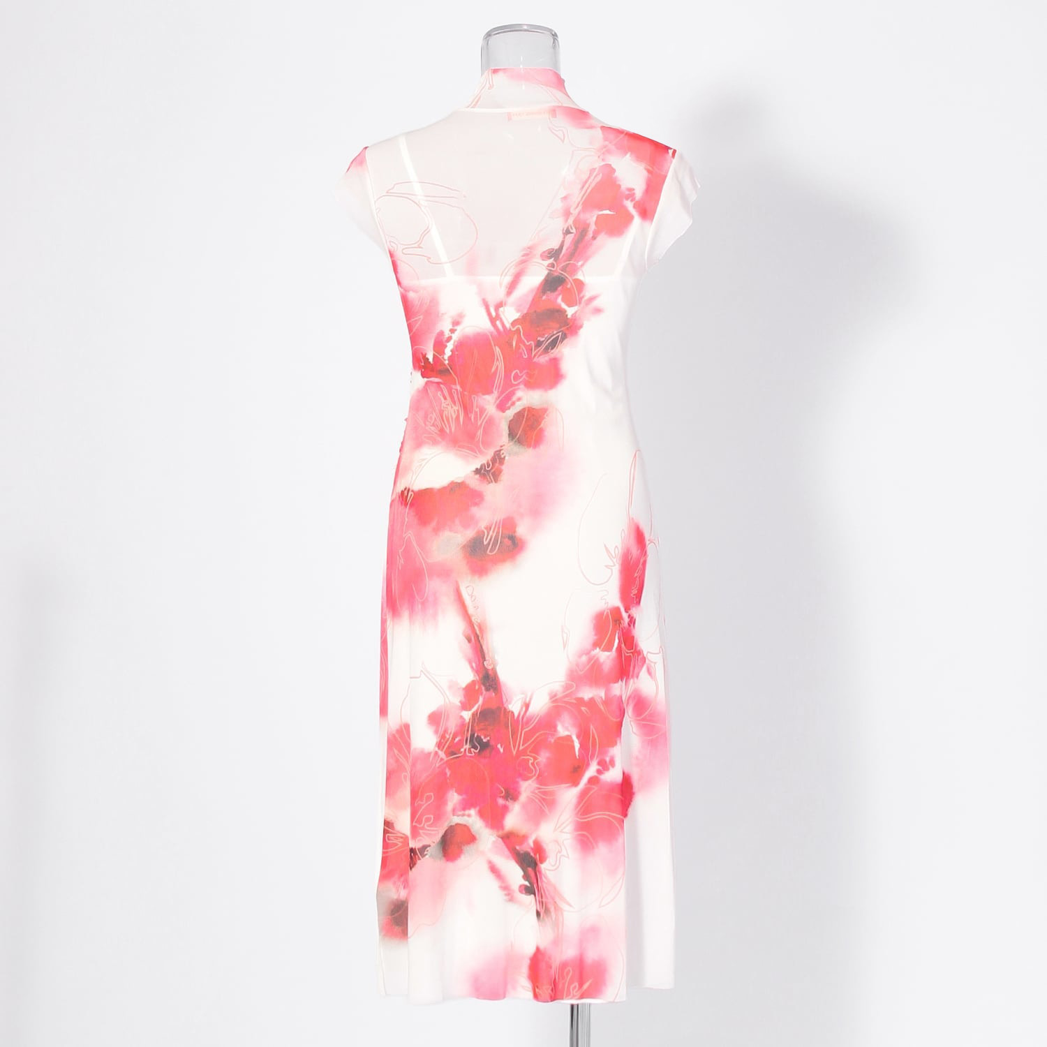 フレームいっぱいに広がる桜の花が美しく彩るワンピース。水彩が滲んだような色にデジタルな輪郭線を重ねた、アーティスティックなルックスが魅力です。脇から流れるドレープはエレガントなアクセントを添えつつウエストラインをほど良くカバーして、デザイン性と機能性を両立。すっきりと身体に添うシルエットで、ボディラインもきれいに見せてくれます。