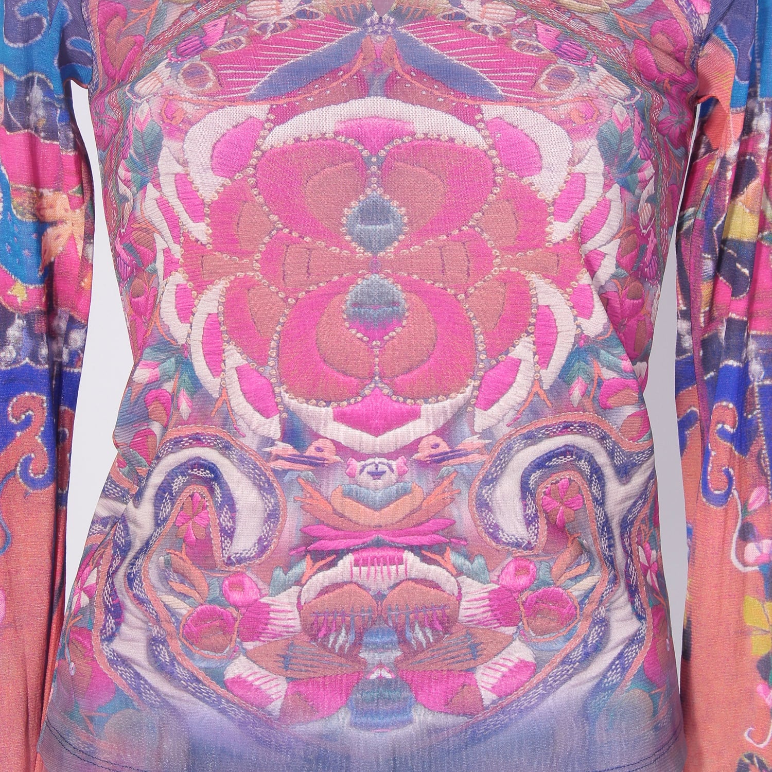 赤ちゃんを包んで背負うための抱っこ紐である「ベイビーキャリア」から着想を得たグラフィックカットソー。2005年の春夏コレクションで展開されていたヴィンテージアイテムのデザインを、現代的なシルエットにアップデートしました。刺繍のような精密プリントに、金魚やタッセルのおもちゃといった遊び心あるモチーフをあしらった一着です。