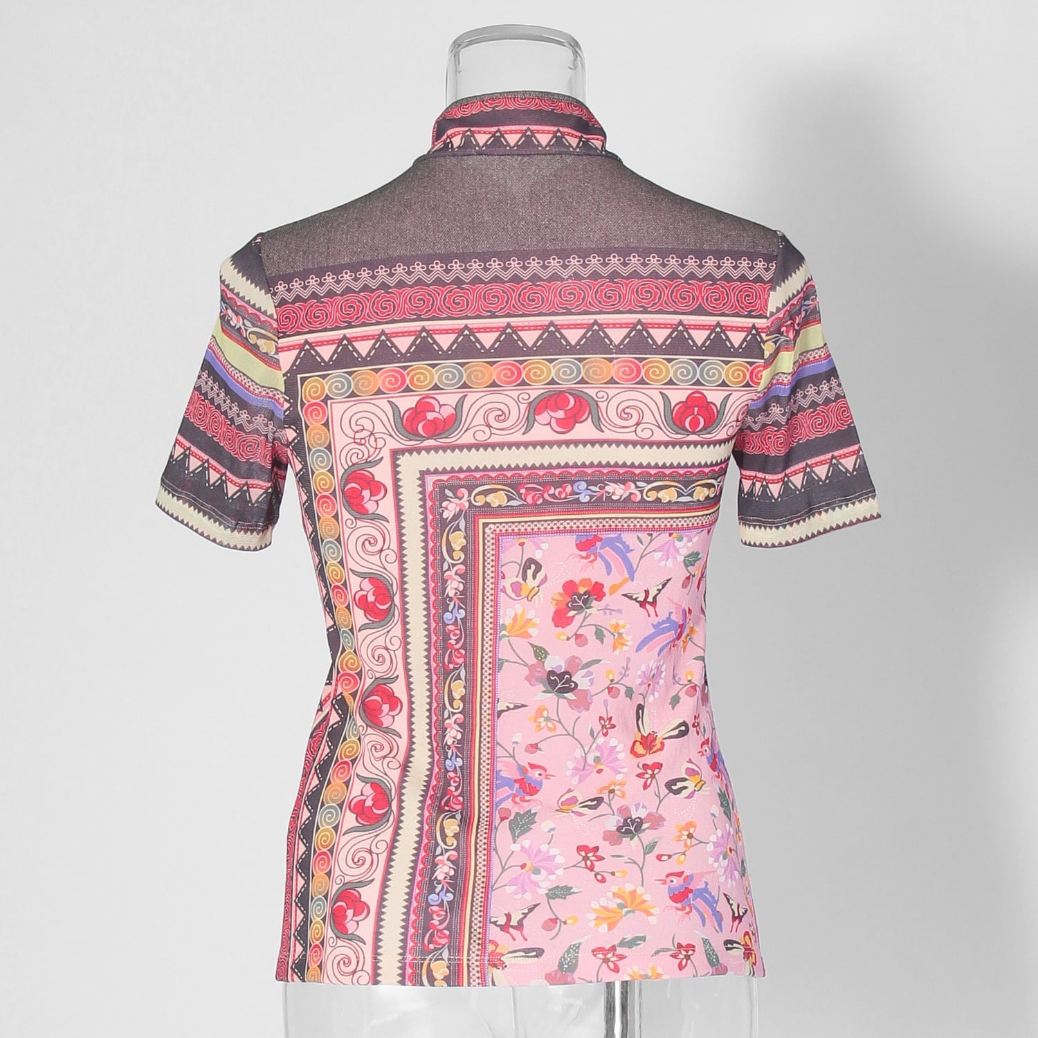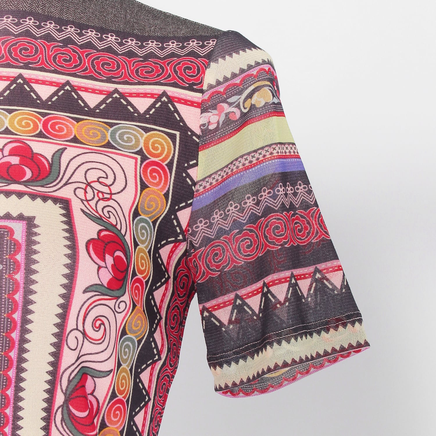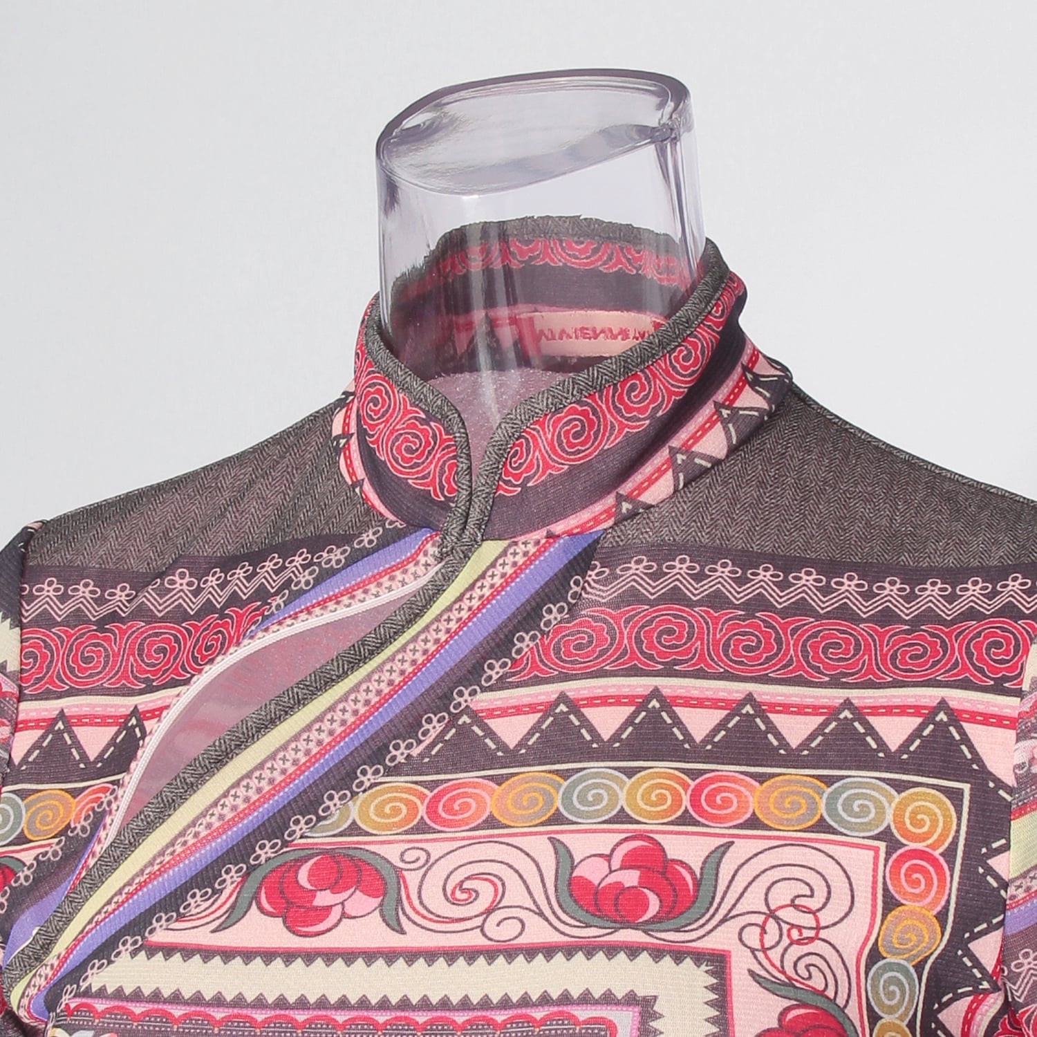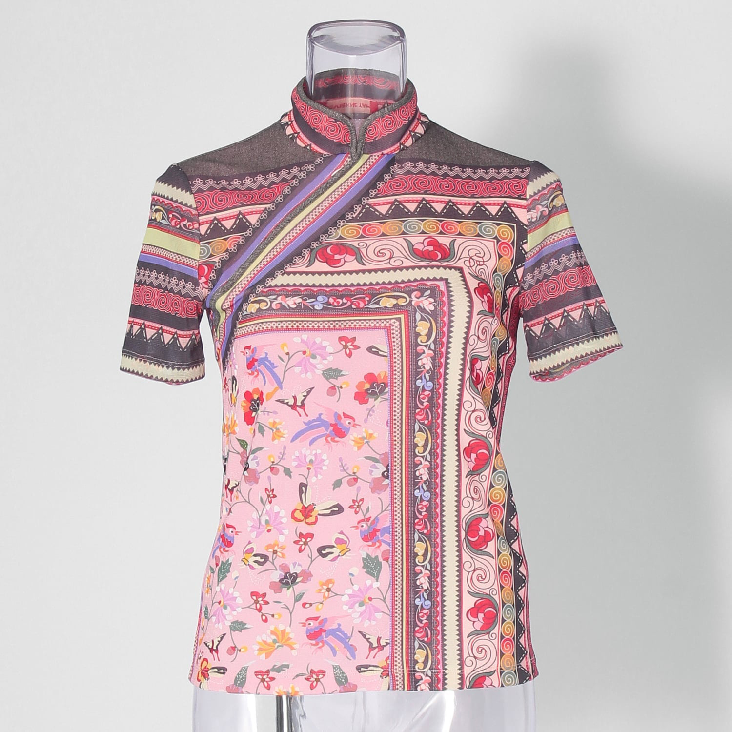 オールドラグからインスピレーションを受けた、伝統的なプリントが目を引くチャイナカラートップス。華やかなピンクにイエローやグレーの締め色を効かせており、洗練された雰囲気で着こなせます。フロントには斜めファスナーの切り替えを施し、アクセントをプラス。しなやかなナイロン素材を使用しているので、着心地も快適です。すっきりとしたシルエットのため、ボリュームのあるボトムスとも相性良く決まります。