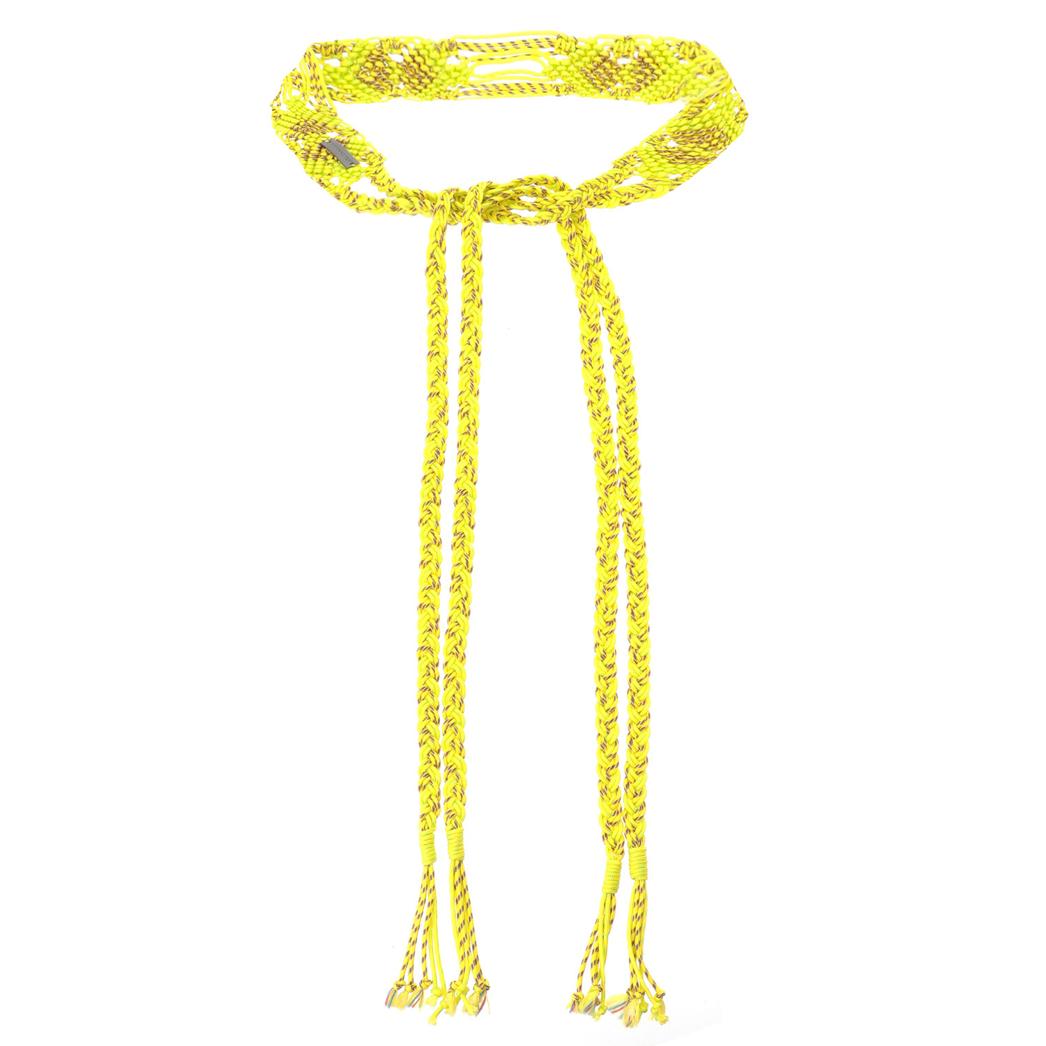 マクラメで編まれたベルトです。発色の良いカラーリングがコーディネートのアクセントとして活躍します。ヴィヴィアン タムのロゴ入りプレートがさりげなく入っているのもポイント。トレンドのウエストマークスタイルに、是非お使いください。