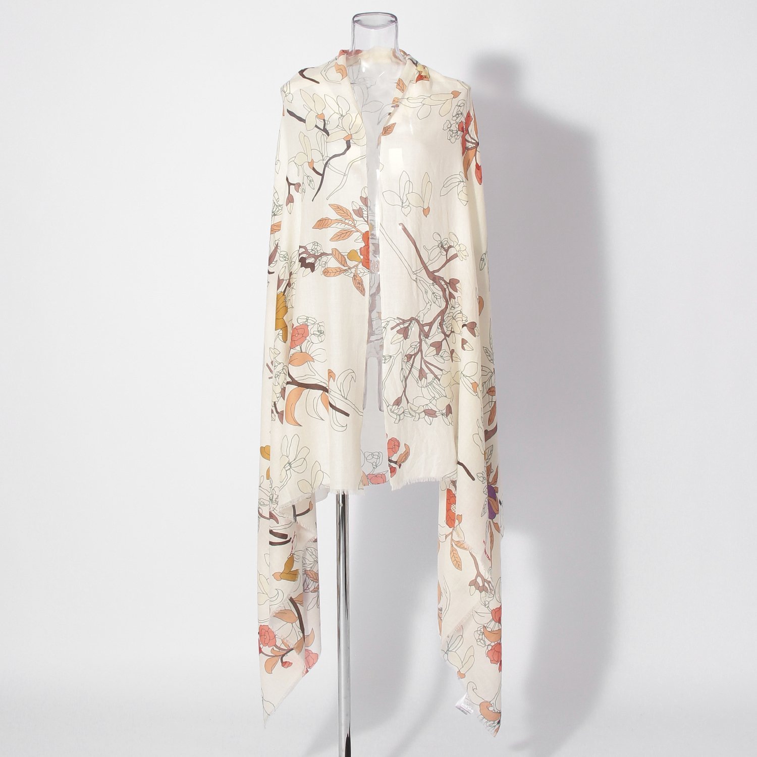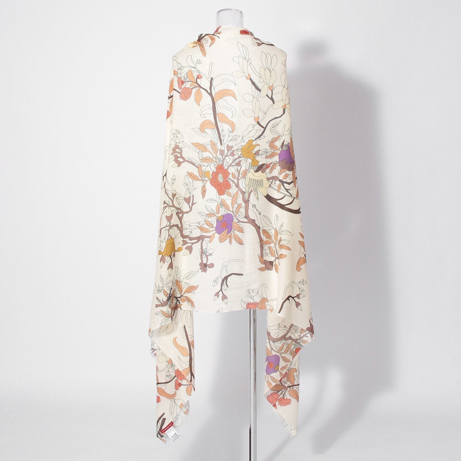 美しいフラワープリントで総柄を表現したストール。花や鳥を描いた美しいデザインは、見ているだけで気分をぐっと盛り上げてくれそうです。柔らかな生地でつけ心地も良く、素肌に触れても快適にご使用いただけます。