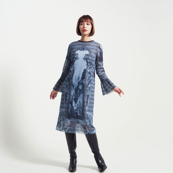 まるで1枚の掛軸のような美しく大胆なプリントが魅力のワンピースです。